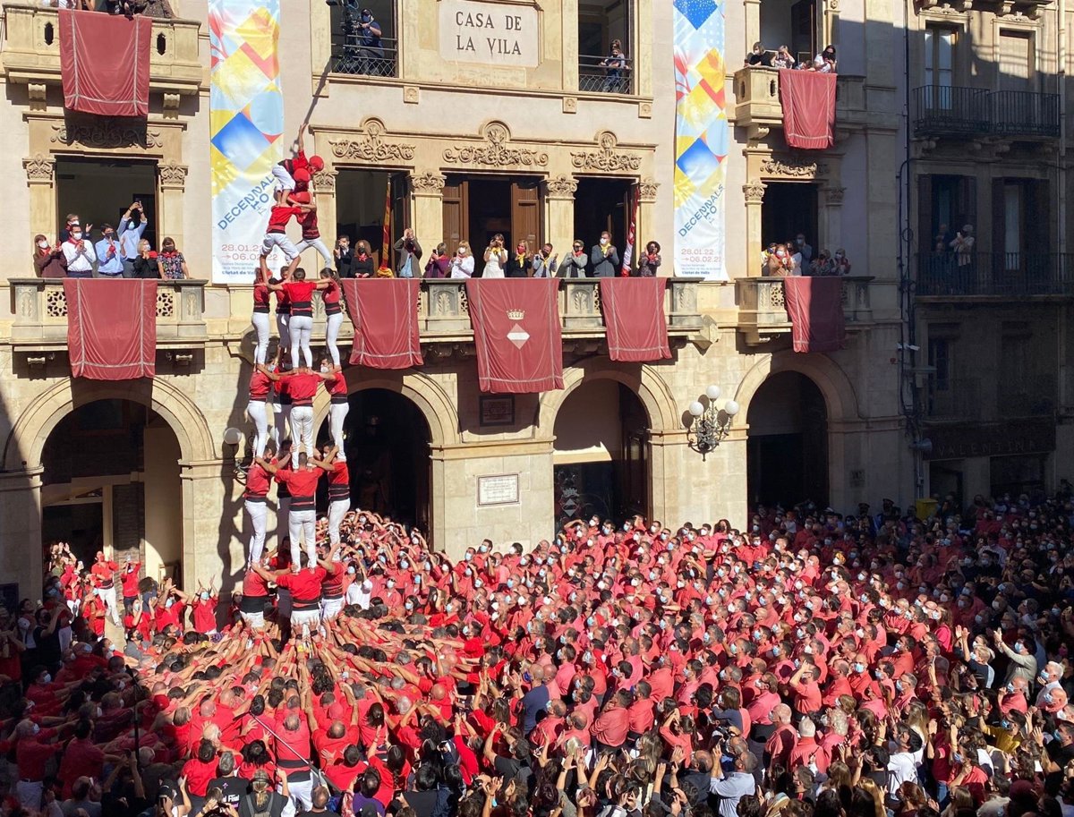 La plaa de Valls (Tarragona) ha acollit aquest diumenge la primera actuació conjunta des que va comenar la pandmia de la covid-19 de les colles castelleres de la ciutat, que han tornat a alar castells sense límit en el nombre de participants i d'aforament en el públic.