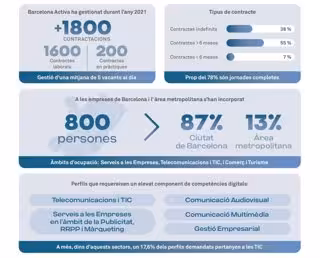 L'agncia econmica i d'intermediació laboral de l'Ajuntament de Barcelona, Barcelona Activa, va gestionar a través de la seva borsa de feina unes 1.800 ofertes al 2021: 1.600 per contractacions laborables i 200 per contractes de prctiques.