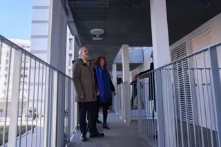L'alcalde ha visitat aquest dimecres al matí la promoció de Cal Cisó (l'última lliurada aquest any), situada al barri de la Marina del Prat Vermell, amb 108 pisos de lloguer, al costat de la primera tinent d'alcalde, Laia Bonet, i el comissionat d'Habitatge, Joan Ramon Riera.