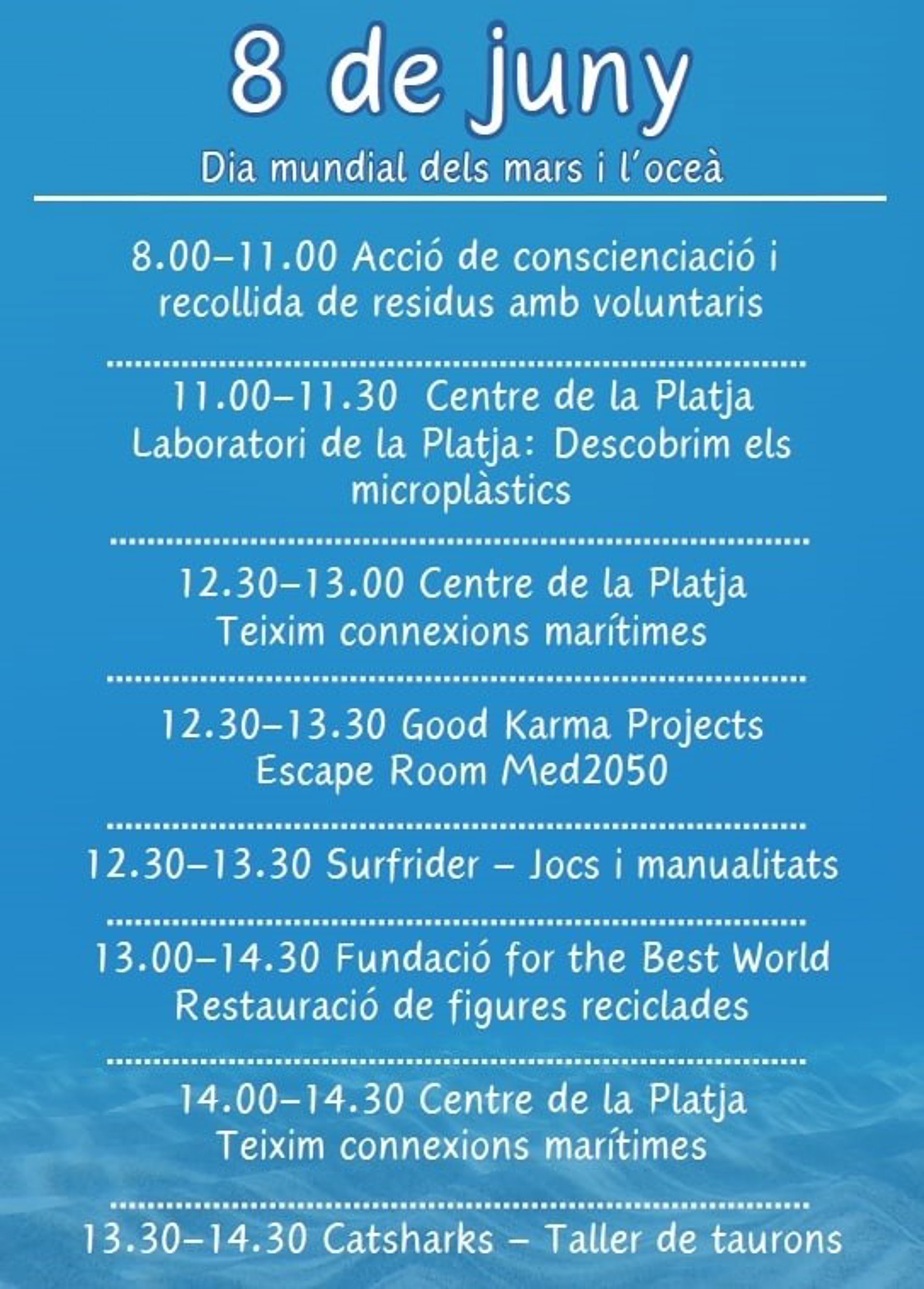 De 8 a 11 es far una recollida de residus amb tres punts de trobada: a la platja de Sant Miquel, Somorrostro-Espigó del Gas i Nova Icria, i, posteriorment, comenaran les activitats, jocs i tallers a la platja del Somorrostro.
