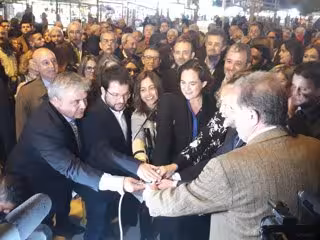 L'alcaldessa de Barcelona, Ada Colau; el vicepresident de la Generalitat, Pere Aragons, i la ministra de Política Territorial, Meritxell Batet, han inaugurat aquest divendres la 48 edició de la Fira d'Abril de Barcelona, que ha arrencat amb l'encs del Prtic de l'entrada del recinte.