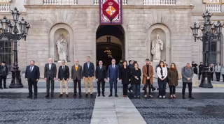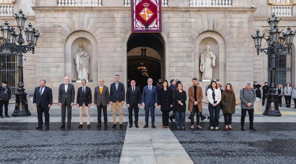 L'alcalde de Barcelona, Jaume Collboni, i representants dels grups municipals han guardat un minut de silenci per commemorar el Dia Europeu de les Víctimes del Terrorisme aquest dimecres al matí a la plaça Sant Jaume de Barcelona.