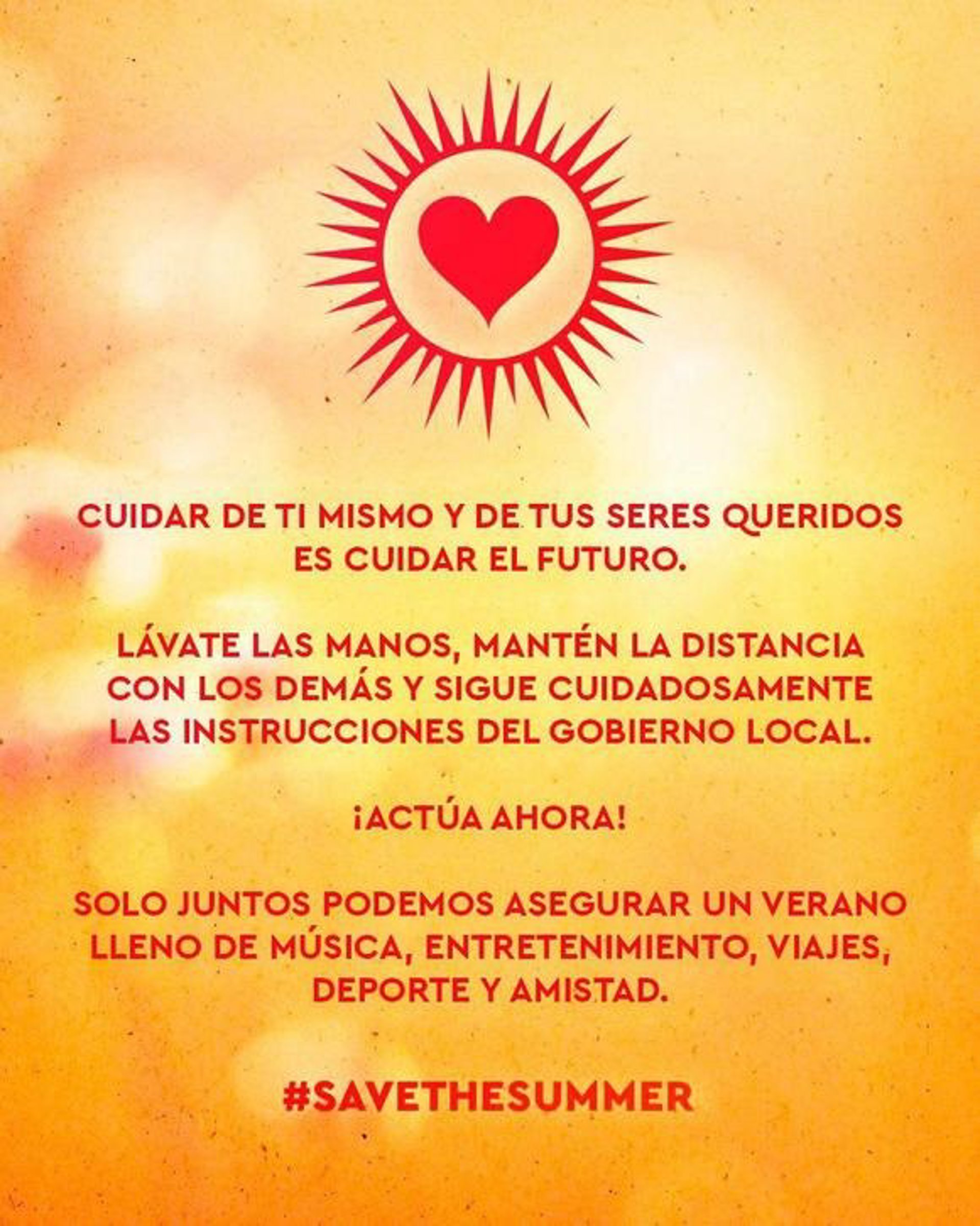 En un comunicat, ha destacat la seva voluntat de contribuir a la detenció de la propagació del coronavirus i garantir així que aquest estiu segueixi estant ple de "música, entreteniment, viatges, esports i amistat".