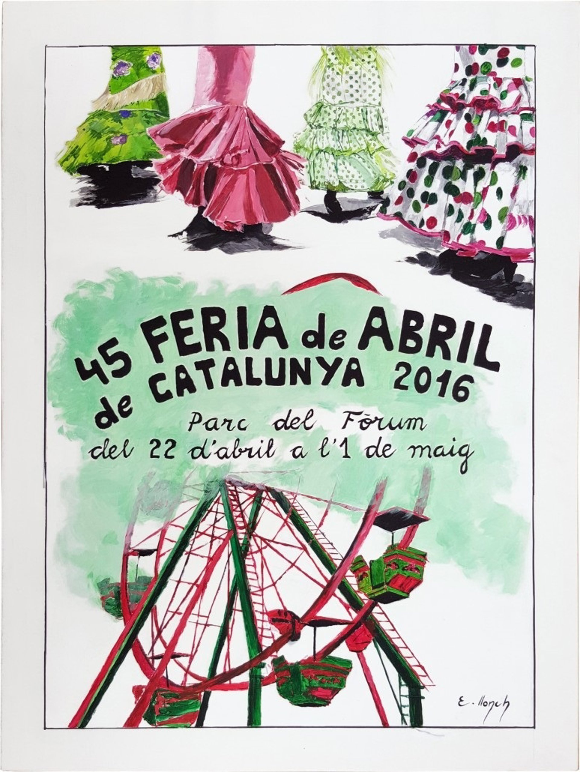 El cartell de la fira representa el moviment dels vestits de sevillanes i les atraccions, en una edició en la qual els organitzadors s'han vist obligats a apujar lleument alguns preus per evitar pèrdues, en un esdeveniment que suposarà a la Fecac uns 800.000 euros, uns 200.000 més que l'anterior edició.