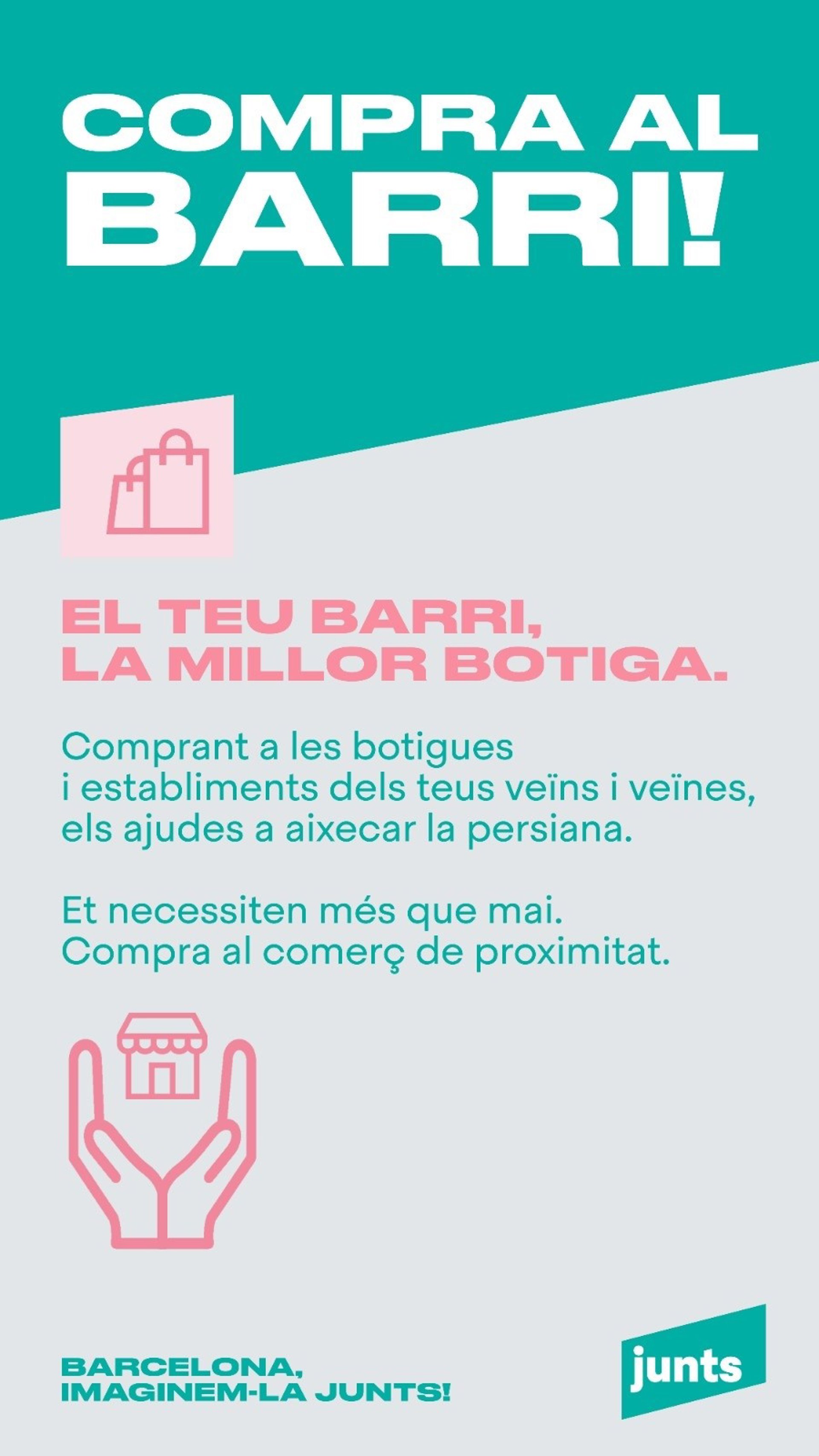 JxCat impulsar aquest dissabte la campanya 'Compra al barri' per donar suport i defensar el comer de proximitat a Barcelona, que ser la primera acció conjunta del grup municipal i del partit constitut que ja s'ha organitzat a Barcelona.