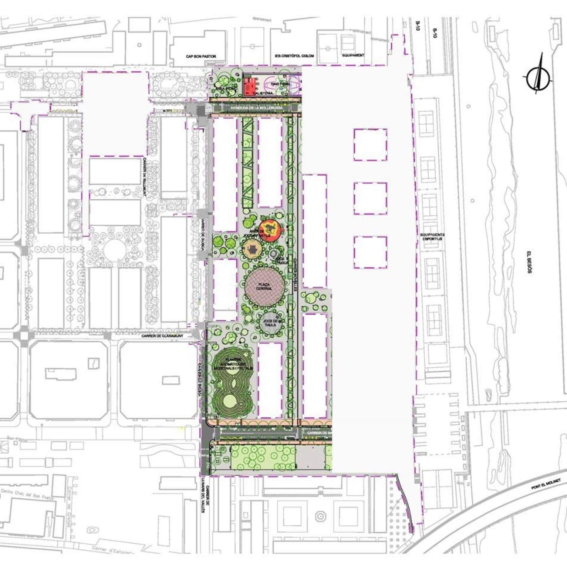 Hi haur una plaa central, nous espais amb jocs infantils i jocs de taula i una rea de pícnic per fomentar els usos venals, així com una superfície verda de 14.000 metres quadrats, i d'altres installacions urbanes.