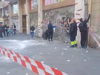 Treballadors del Metro de Barcelona han collocat una cinta envoltant la seu de BComú, que tnia els persianes baixades quan han arribat, en la qual han enganxat cartells amb el missatge 'Perill, amiant en comú' i 'Amiant mata'.