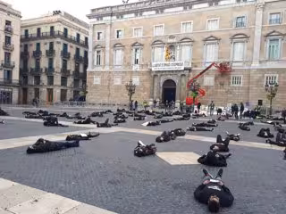 Els participants de la protesta, que ha tingut lloc aquest dilluns a les 11 hores, anven vestits amb roba fosca i pancartes, i s'han estirat davant la Generalitat.