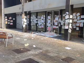 Durant la protesta, els treballadors han penjat cartells amb els lemes 'Conveni manipulat, personal maltractat', 'Volem un conveni digne' i 'Sector no uniformat, sector oblidat' i han llançat ous a la façana.