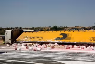 Un vehicle ha bolcat la seva crrega de pots de pintura, per a causa del sinistre no hi ha hagut cap persona atrapada