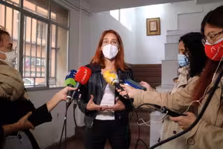 Pla americ de la presidenta de CatECP al Parlament, Jéssica Albiach, atenent les periodistes després de reunir-se amb sindicats i entitats socials a Tortosa. Imatge del 2 d'octubre del 2020 (horitzontal) - Anna Ferrs (ACN)