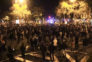 Cap a les vuit del vespre els manifestants han decidit aixecar la concentració davant la delegació del govern espanyol i s'han encaminat fins a l'avinguda Diagonal. Després s'han dirigit a la plaa Cinc d'Oros i un cop all s'han assegut a terra per tal de tallar el trnsit en aquest punt, a la crulla de la Via Augusta amb el carrer Pau Claris. El tall ha comenat poc després d'un quart de nou de la nit.