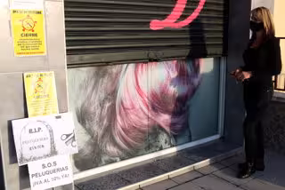 Imatge de Maribel Estrada, promotora del grup 'Creer en nosotros', abaixant la persiana de la seva perruqueria a Gav el 20 d'octubre de 2020. (Horitzontal) - lex Recolons (ACN)