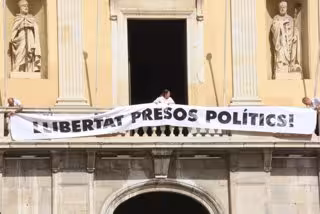 Tarragona.-El balcó de lAjuntament de Tarragona llueix des daquest dijous al matí una pancarta de suport als presos independentistes. La lona porta inscrita el lema Llibertat presos polítics! i ha estat collocada per tres operaris a les onze del matí. En el darrer ple es va aprovar la mesura, grcies al vot de qualitat de lalcalde, ja que hi va haver un empat a vots. Hi van votar a favor ERC, Junts per Tarragona i la CUP. En Comú Podem, soci de govern dERC, es va abstenir, i el PSC, Ciutadans i PP hi van votar en contra. Labsncia dun regidor socialista va provocar un empat.