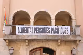 La Bisbal d'Empord.-L'Ajuntament de la Bisbal d'Empord ha substitut la pancarta a favor al dret a l'autodeterminació per una amb el lema 'Llibertat persones pacífiques'. A més, el consistori també ha hagut de retirar un lla groc, una estelada i una bandera en suport als joves d'Alsasua condemnats per agredir dos gurdies civils. Tot plegat després d'una denúncia que va presentar Ciutadans que actualment no té representació a l'ajuntament. A la faana del consistori ara només hi llueix una bandera del collectiu LGTBI i la pancarta amb el nou lema, i que s'ha canviat aquesta setmana després del requeriment de la Junta Electoral Central (JCE) perqu retirés la que feia referncia al dret a l'autodeterminació i que estava en angls. A baix hi ha la bandera de la Bisbal i la Senyera.