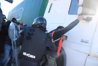 La Jonquera.-Un camió ha intentat atropellar un grup de manifestants a l'N-II a la Jonquera. Tot i que la carretera est tallada, el camioner ha decidit tirar pel dret i ha avanat malgrat els crits i els cops de porra que els propis Mossos d'Esquadra clavaven al vehicle perqu s'aturés. Els concentrats li han tirat pedres i tot tipus d'objectes i han trencat el vidre de davant del camió, de matrícula espanyola. Els concentrats s'han hagut d'apartar de pressa i corrents per no resultar ferits. El camió ha fet una rotonda en sentit contrari i finalment s'ha aturat perqu s'ha trobat amb diverses furgonetes dels Mossos aparcades i quatre agents que s'han plantat al davant. La policia se l'ha emportat.