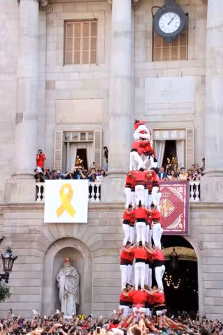 Barcelona.-Els Castellers de Barcelona, els de Vilafranca i els Minyons de Terrassa han fet vibrar aquest diumenge la plaa Sant Jaume en la Diada Histrica de la Merc. Els amfitrions han celebrat el seu 50 aniversari i ho han fet recuperant el 7 de 8 per primer cop aquest any. Els de la camisa verda han ofert un 4 de 9 amb folre, una torre de 9 amb folre, un 3 de 9 amb folre i un pilar de 8 amb folre i manilles. De la seva banda, els de la camisa malva han aixecat un 2 de 9 amb folre i manilles, un 3 de 9 amb folre, un 5 de 8, i un pilar de set amb folre. Els amfitrions, a banda del 7 de 8, han completat un 3 de 8 i un 4 de 8, en una jornada que s'ha allargat quatre hores.