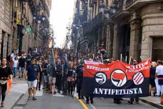 Barcelona.-Al voltant de 300 antifeixistes han recorregut el centre de Barcelona aquest dissabte al migdia per protestar contra el Dia de la Hispanitat. Amb crits, banderes i pancartes contra el feixisme, els neonazis i els cossos policials, els manifestants també han criticat la festivitat del 12 d'octubre, el colonialisme i el capitalisme, i s'han sentit algunes proclames a favor dels CDR presos, el Kurdistan i els immigrants. No hi ha hagut cap incident, i en el manifest final han fet una crida a lluitar contra el feixisme al carrer.