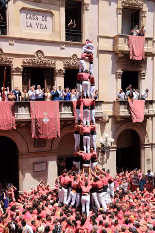 La Vella ha arrencat amb un tres de nou amb folre. Una estructura que ha carregat amb slida suficincia i que, posteriorment, descarregada sense patiment enmig d'una plaa del Blat que intentava sobreposar-se a la calor i el sol del migdia. La Joves ha respost amb la mateixa moneda i ha aixecat també la mateixa construcció. Ben aconseguida la crrega, els de la camisa vermella han hagut de treballar fora per descarregar-lo, al final sense problemes.En la segona ronda, la Vella ha redoblat l'aposta i ha plantat un 2 de 9 amb folre i manilles, el primer gamma extra d'aquesta temporada. Novament, ho ha fent gala d'una estructura robusta i una execució precisa, que no ha arribat a trontollar de forma seriosa en cap moment. La descrrega d'aquesta torre ha fet esclatar el primer gran moment d'eufria castellera aquesta temporada per part dels de la camisa rosada. La Joves ha intentat contrarestar aquesta construcció amb un 4 de 9 amb folre, que han desmuntat amb els sisens collocats. La canalla, que ja estava arribant a aquest punt, s'ha acabat fent enrere quan ha vist que l'estructura no garantia una solidesa suficient per coronar-la amb garanties. En la repetició, els de la camisa vermella han aconseguit carregar i descarregar sense problemes un 3 de 8 amb l'agulla.Per a la tercera ronda, la Vella ha descarregat el 4 de nou amb folre. Tot i que en un primer moment han hagut de refer els primers nivells de l'estructura, han aconseguit aixecar i descarregar aquest castell amb solvncia i certa comoditat. La Joves ha intentat agafar el guant. Per quan havia ja posat els sisens, ha hagut de desmuntar l'intent. Finalment, els de la camisa vermella han optat pel 2 de 8 amb folre, que han aconseguit descarregar després de defensar-lo amb ungles i dents.La Vella ha tancat la seva actuació amb un pilar de 7 amb folre. En aquesta ocasió, com ja havia passat a l'inicia de la diada, amb el 3 de nou amb folre de la primera ronda, els de la camisa vermella han tancat també amb la mateixa estructura: el pilar de 7 amb folre.