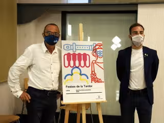 Pla mitj de l'alcalde de Lleida, Miquel Pueyo i el regidor de Joventut i Festes, Ignasi Amor, al costat del cartell de les Festes de la Tardor de Lleida, el 18 de setembre de 2020 (Horitzontal) - Anna Berga (ACN)