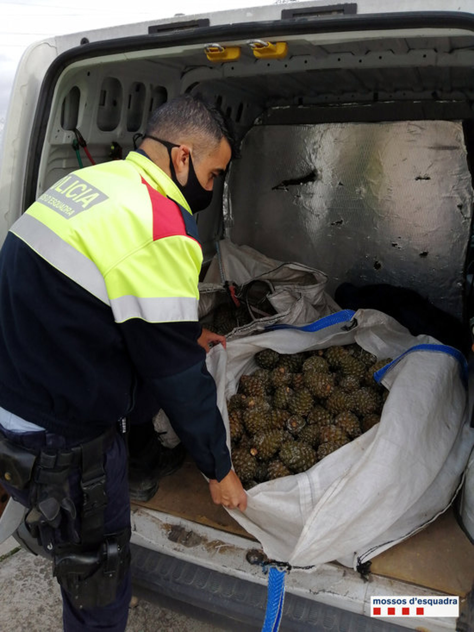 Pla general de les pinyes recollectades que duien a l'interior de la furgoneta. Imatge del 6 de novembre del 2020. (Vertical) - Mossos d'Esquadra (ACN)