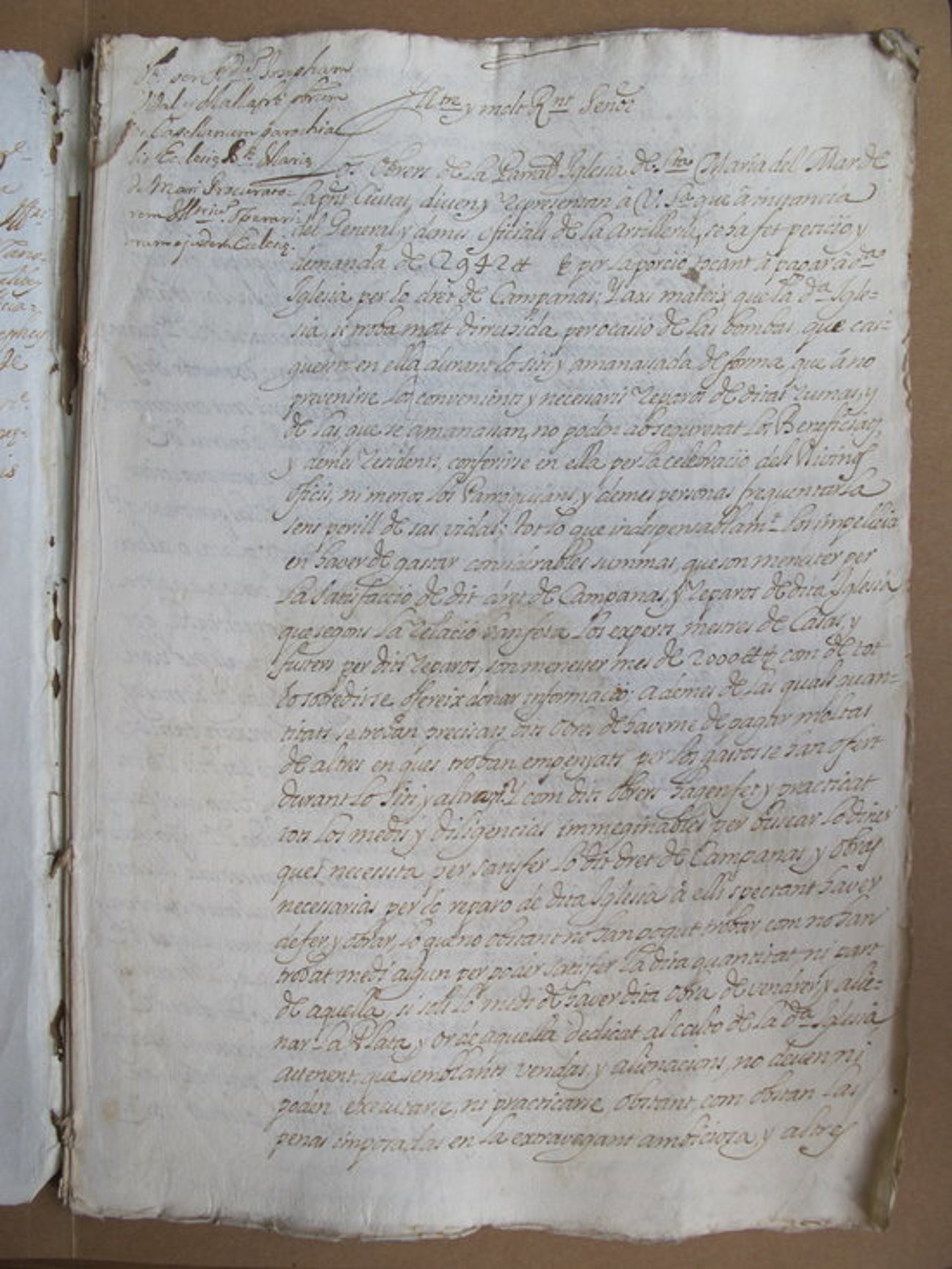 Entre els documents trobats hi ha una petició feta el 21 doctubre de 1714 per la junta de Santa Maria del Mar. En ella "los obrers de la parrquia Iglesia de Santa Maria del Mar de la present ciutat diuen y representan a vostre senyoria que a instncia del General y demes oficials de la Artilleria se ha fet petició y demanda de 2942 lliures per la porció tocant a pagar a dita Iglesia per lo dret de campanes (el vencedor retirava totes les campanes que havien cridat a somatent i, per recuperar-les, shavia de pagar un tribut elevat); y axi mateix que la dita Iglesia se troba molt dirruida per ocasió de las bombes que caigueren en ella durant lo siti, y amanassada de forma que a no prevenirse los convenients y necessaris reparos de dites ruinas, y de las que se amanassan, (..) reparos de dita Iglesia que segons la relació han feta los experts mestres de cases y fusters per dits reparos, son menester mes de 2000 lliures".Els responsables del temple afegeixen també que "ademes de las quals quantitats se troban precisats dits obres de haverne de pagar moltes de altres en ques troban empenyats per los gastos se han sofert durant lo siti 'per demanar al bisbat poder vendre' la plata, or y demes alages de dita Iglesia fins a la concorrent quantitat que sia menester tant per la satisfacció y paga que importa lo dit dret de campanes com y també las obras y reparos necessaris y demes deutes atrassats y deguts (..) dits obrers de present necessitan per dits efectes la quantitat de set mil y setcentas lliures".La resposta del bisbat va ser afirmativa, segons recull un altre document, i Santa Maria del Mar va vendre per valor de 3.387 lliures "una imatge de Santa Madrona, quatre palmatorias de fullatge..quatre vasijas, dos grans i dos xicasuna corona del S Ecce Homo espatllada, un palio de plata.y un parell de palmatries molt grans", entre daltres objectes de culte.Per arribar a les 7.700 lliures totals es va recórrer a un dipsit que diferents nobles i prohoms van fer en el seu moment "per la custodia de plata que se esperava fer per D Iglesia". Eren, entre daltres, el marqus "Don Carlos de Llupiá, D. Pau Dalmases i Ros" (que va ser ambaixador de la Catalunya austriacista a Londres fins al 1714) o el comerciant Ignasi Fontanet i Martell (que va acabar sent el tresorer de les obres de la Ciutadella).