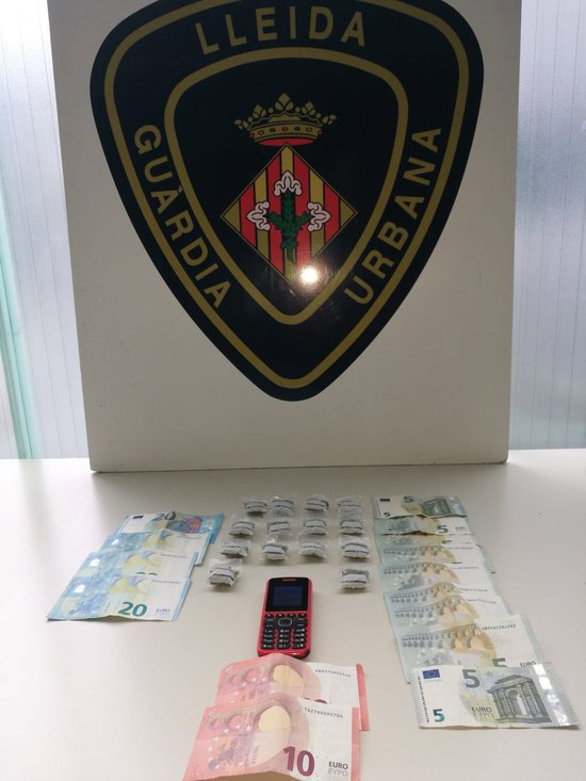 Imatge dels embolcalls de marihuana i de bitllets fraccionats intervingut al detingut al barri de Pardinyes de Lleida, el 18 de setembre del 2020. (Vertical) - Cedida per la Gurdia Urbana de Lleida (ACN)