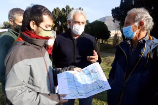 El representants de les entitats naturalistes i el d'Unió de Pagesos, mirant el plnol de les dues alternatives que es proposen per a la variant de Torroella aquest 19 d'octubre del 2020 (Horitzontal) - Xavier Pi (ACN)