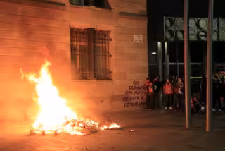 Foguera amb palets i una pintada contra els desnonaments a la plaa de Sant Miquel, després d'una manifestació amb centenars de persones que havia comenat a la plaa de la Catedral. 31 d'octubre del 2020. (Horitzontal) - Laura Fíguls (ACN)