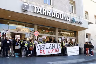 Tarragona.-Els vigilants de seguretat que treballen per Renfe a la demarcació de Tarragona han exigit aquest dijous un plus salarial de perillositat de 400 euros i més mesures de protecció -com ara armilles antibales i armes- davant les agressions que, diuen, pateixen a diari. Segons el collectiu, en la darrera setmana han hagut dagafar la baixa 7 dels 32 efectius de la zona de Tarragona. Convocats pel Sindicat de Treballadors (STR), prop duna trentena de persones shan manifestat a les portes de lestació del ferrocarril de Tarragona amb xiulets i pancartes. El collectiu vol repetir les accions de protesta cada divendres, de forma indefinida, fins que no satenguin les seves reivindicacions.