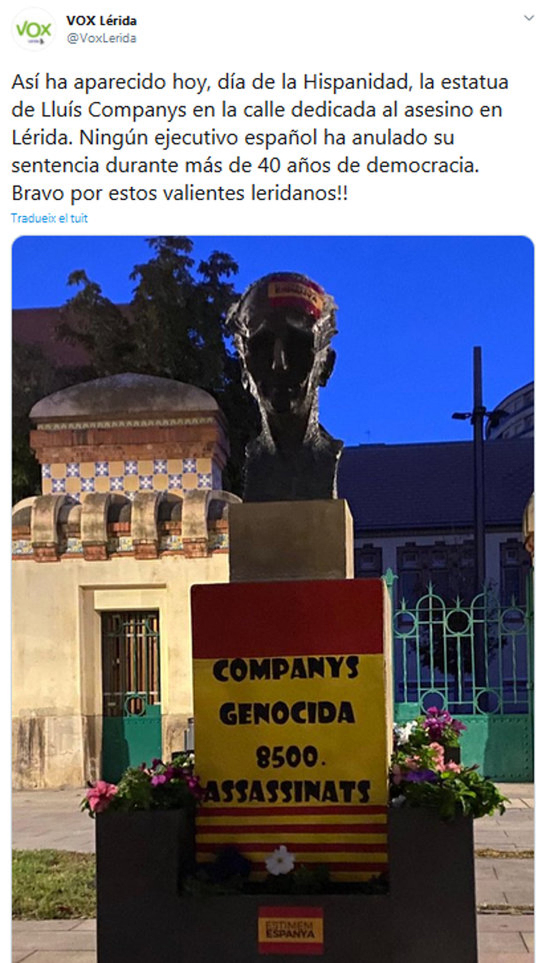 Per la seva part, la també diputada Gemma Espigares ha condemnat "la manera de fer política, o no política" d'algunes formacions. A la vegada, ha destacat el "costat hum" de Lluís Companys i ha posat d'exemple el fet que, "desbordat per la gran quantitat d'assassinats que es van produir a la rereguarda els dies posteriors al fallit cop d'estat, decidís deixar partir del port de Barcelona en vaixells estrangers unes cinc mil persones sospitoses de poca simpatia amb el rgim republic".Les dues diputades al Parlament han estat acompanyades en la presentació de la denúncia pel president de la Federació Regional de Lleida d'ERC, Miquel Serra; la presidenta i el secretari general de la federació comarcal del Segri, Gemma Massana i Antoni Bosch, i el president de la secció local de Lleida, Josep Maria Baiget.En concret, en el tuit publicat per Vox Lleida s'hi podia llegir "Así ha aparecido hoy, día de la Hispanidad, la estatua de Lluís Companys en la calle dedicada al asesino en Lérida. Ningún ejecutivo español ha anulado su sentencia durante más de 40 años de democracia. Bravo por estos valientes leridanos!!"