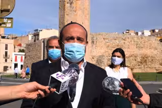 Pla mitj del president de PP, Alejandro Fernández, en l'atenció als mitjans a Tarragona prvia a una reunió del partit. Imatge del 27 de setembre del 2020 (Horitzontal). - Mar Rovira (ACN)