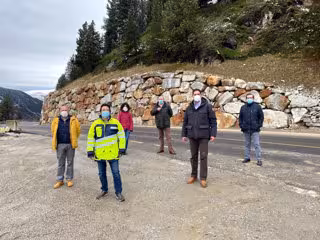 Pla general del secretari dInfraestructures i Mobilitat, Isidre Gavín, a la C-28 a Naut Aran, el conseller de Territori, del Govern arans, Francisco Bruna, i l'alcalde de Naut Aran, César Ruiz-Canela. Imatge del 27 d'octubre del 2020. (horitzontal) - Cedida a l'ACN pel TES (ACN)