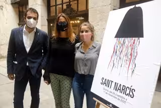 El vicealcalde i regidor de Cultura, Quim Ayats, al costat de les integrants del collectiu 'La noia del monyo' amb el cartell de Sant Narcís, aquest 21 d'octubre del 2020 (Horitzontal) - Xavier Pi (ACN)