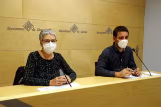 El portaveu de Guanyem Girona, Lluc Salellas, i la regidora de la formació Dolors Serra, durant la roda de premsa d'aquest 5 de novembre del 2020 (Horitzontal) - Xavier Pi (ACN)