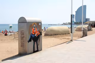 Barcelona.-L'artista itali resident a Barcelona TVBoy ha convertit scar Camps en sant en la seva última obra urbana feta aquest dijous a la nit. El fundador de l'ONG Proactiva Open Arms sosté un migrant rescatat a l'estil de la 'Pietat' de Miquel ngel. "Aquesta nit a la platja de la Barceloneta ha aparegut un nou sant: Sant scar Camps", ha dit el grafiter a través de les xarxes socials. L'obra, titulada 'La Piet di San Oscar', est feta com és habitual en les obres de TVBoy sobre mobiliari urb, en aquest cas just on comena la sorra de la platja de la Barceloneta, a l'alada de la plaa del Mar, amb la qual cosa el mar Mediterrani apareix com a fons de l'obra.