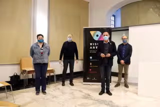 D'esquerra a dreta: la vicepresidenta de la Diputació de Lleida, Estefania Rufach; el regidor de Cultura, Jaume Rutllant; l'alcalde de Lleida, Miquel Pueyo, i el director del Festival Visual Art, Santi Lapeira. Imatge del 6 d'octubre de 2020. (Horitzont - Laura Cortés (ACN)