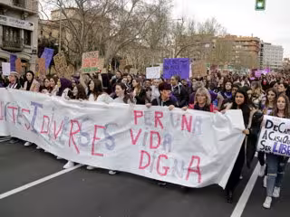 Pla obert de la pancarta que ha encapalat la manifestació feminista del 8M a Lleida, convocada per Marea Lila, el 8 de mar de 2020 (Horitzontal) - Anna Berga (ACN)