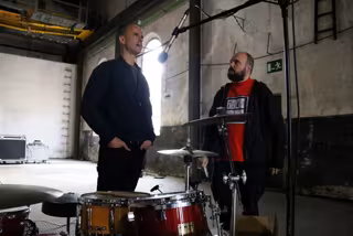 Marc Sempere i El Niño de Elche conversen al davant d'una bateria a la fbrica de l'Annima de Manresa. Imatge publicada el 15 d'octubre de 2020. (Horitzontal) - Mar Martí (ACN)