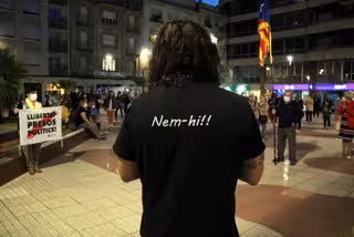 Primer pla del lema de la samarreta d'Ernest Redó, portaveu de l'ANC, mentre llegia el manifest de l'Assemblea contra la inhabilitació de Torra a la concentració de la plaa Alfons XXII de Tortosa. Imatge del 28 de setembre del 2020 (horitzontal) - Anna Ferrs (ACN)