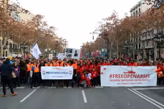 Barcelona.-Amb el lema 'Free Open Arms', mig miler de persones, segons la Gurdia Urbana i 2.000 segons els organitzadors, s'han manifestat aquest dissabte pel centre de Barcelona per mostrar el seu rebuig al bloqueig del vaixell de Proactiva Open Arms al port de Barcelona. A la manifestació, convocada pels voluntaris de l'ONG, s'han sentit crits com ara 'cap persona és illegal' o 'no rescatar és assassinar'. La marxa ha acabat amb un minut de silenci i amb la denúncia que 'els dies que el vaixell est aturat es compten en morts i no en hores'. scar Camps, fundador de l'ONG, ha estat molt crític amb l'executiu espanyol i l'ha culpat de la mort, aquest divendres a la matinada, de 117 morts per un nou naufragi al Mediterrani.