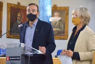 L'alcalde d'Olot, Pep Berga, i la regidora d'Hisenda, Montse Torras, durant la roda de premsa d'aquest 22 d'octubre del 2020. (Horitzontal) - Cedida per l'Ajuntament d'Olot (ACN)