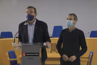 L'alcalde d'Olot, Pep Berga, i el cap de l'rea de Territori de l'Ajuntament, Ramon Prat, durant la roda de premsa d'aquest 12 de novembre del 2020. (Horitzontal) - Gemma Tubert (ACN)