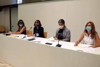 Pla mitj dels tinents d'alcalde de la Paeria de Lleida, Montse Pifarré i Sergi Talamonte, i les regidors Sandra Castro i Anna Campos, durant la presentació de les ordenances fiscals 2021, el 24 de setembre del 2020. (Horitzontal) - Salvador Miret (ACN)