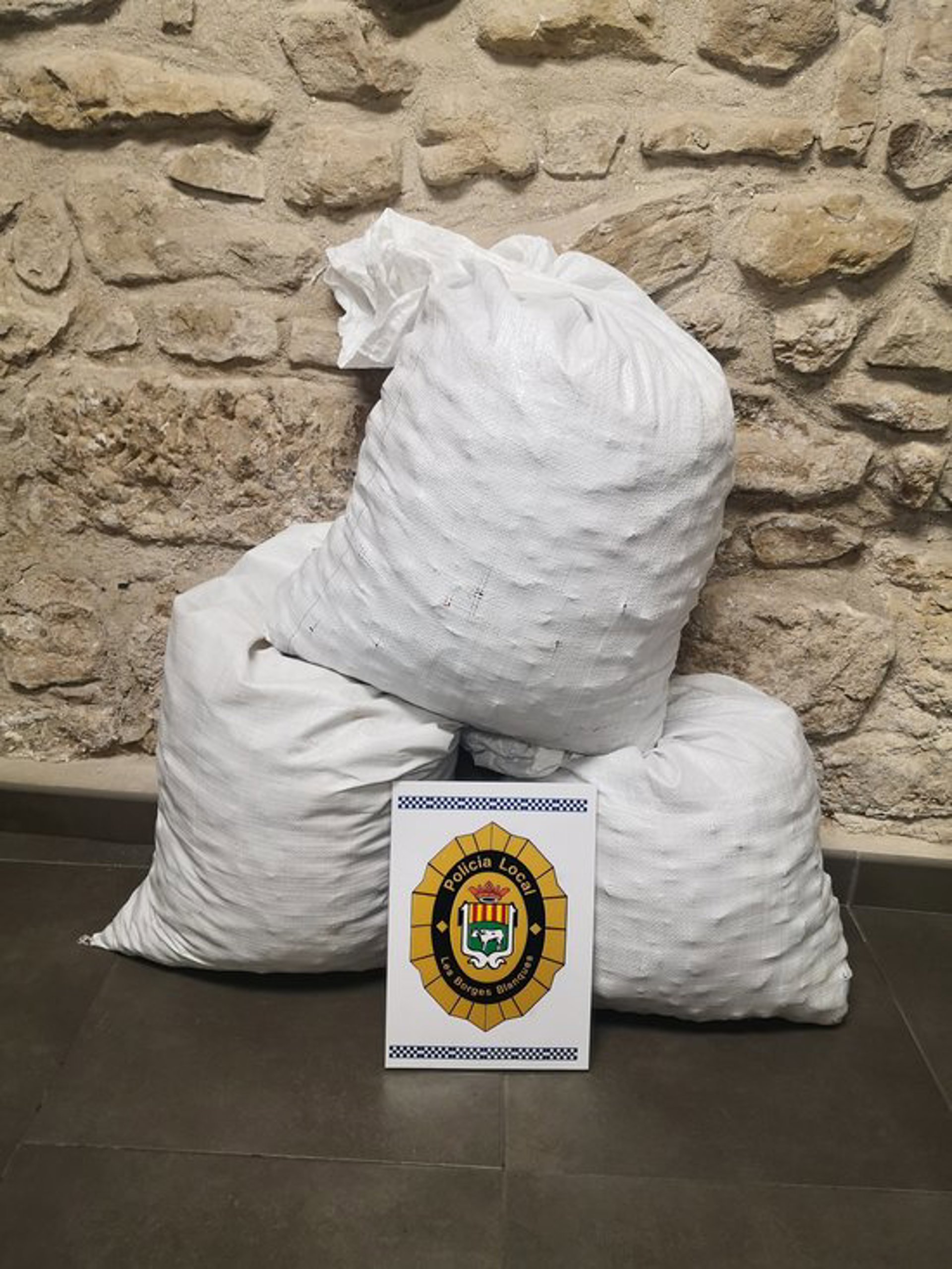 Pla mitj on es poden veure els sacs d'ametlles furtades a les Borges Blanques, el 30 de setembre de 2020. (Vertical) - Cedida per l'Ajuntament de les Borges Blanques (AC