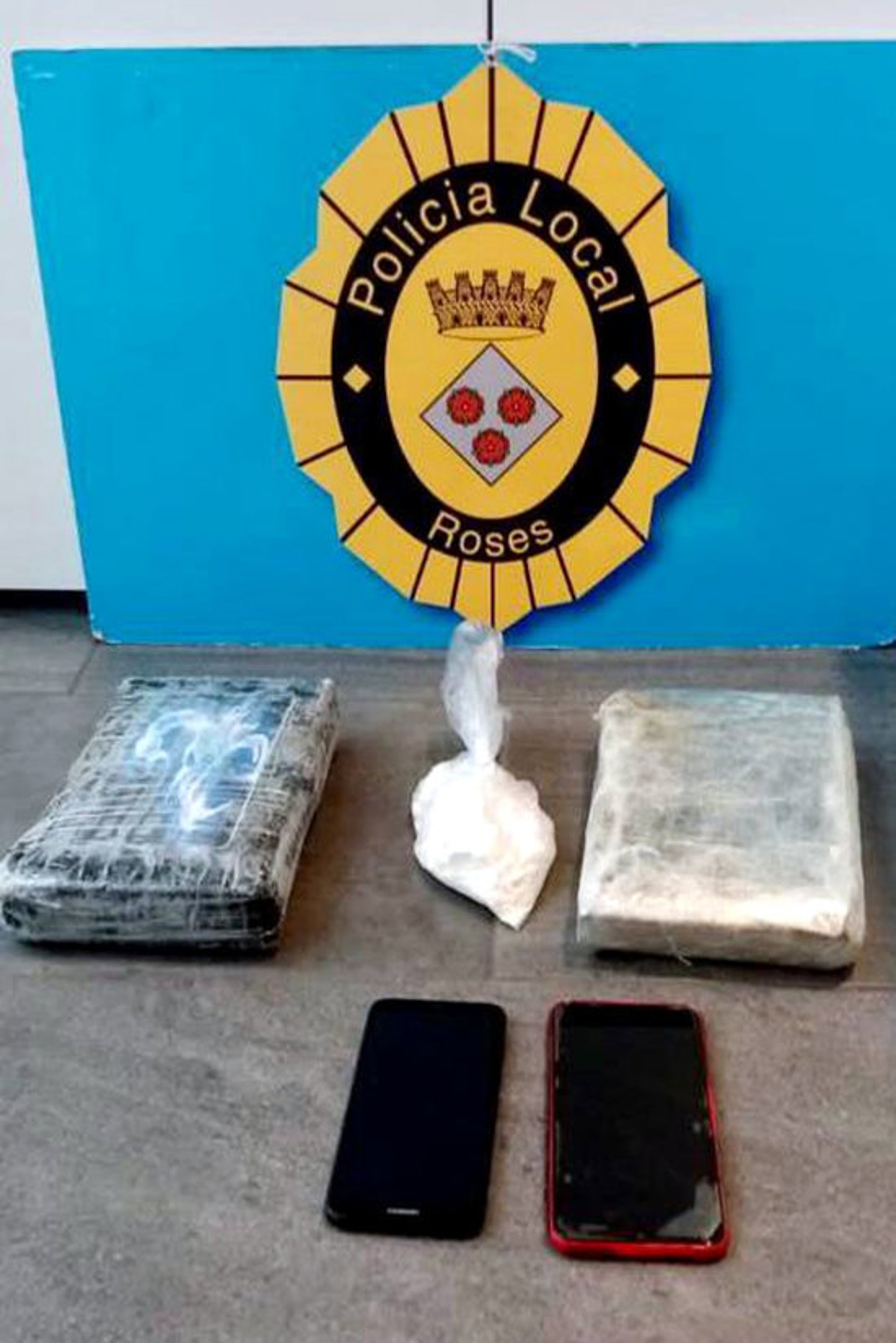Els fardells amb els 2,8 quilos de cocana que ha interceptat la Policia Local de Roses durant el control d'aquest 3 de novembre del 2020 (Vertical) - Cedida per l'Ajuntament de Roses (ACN)