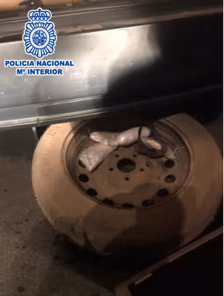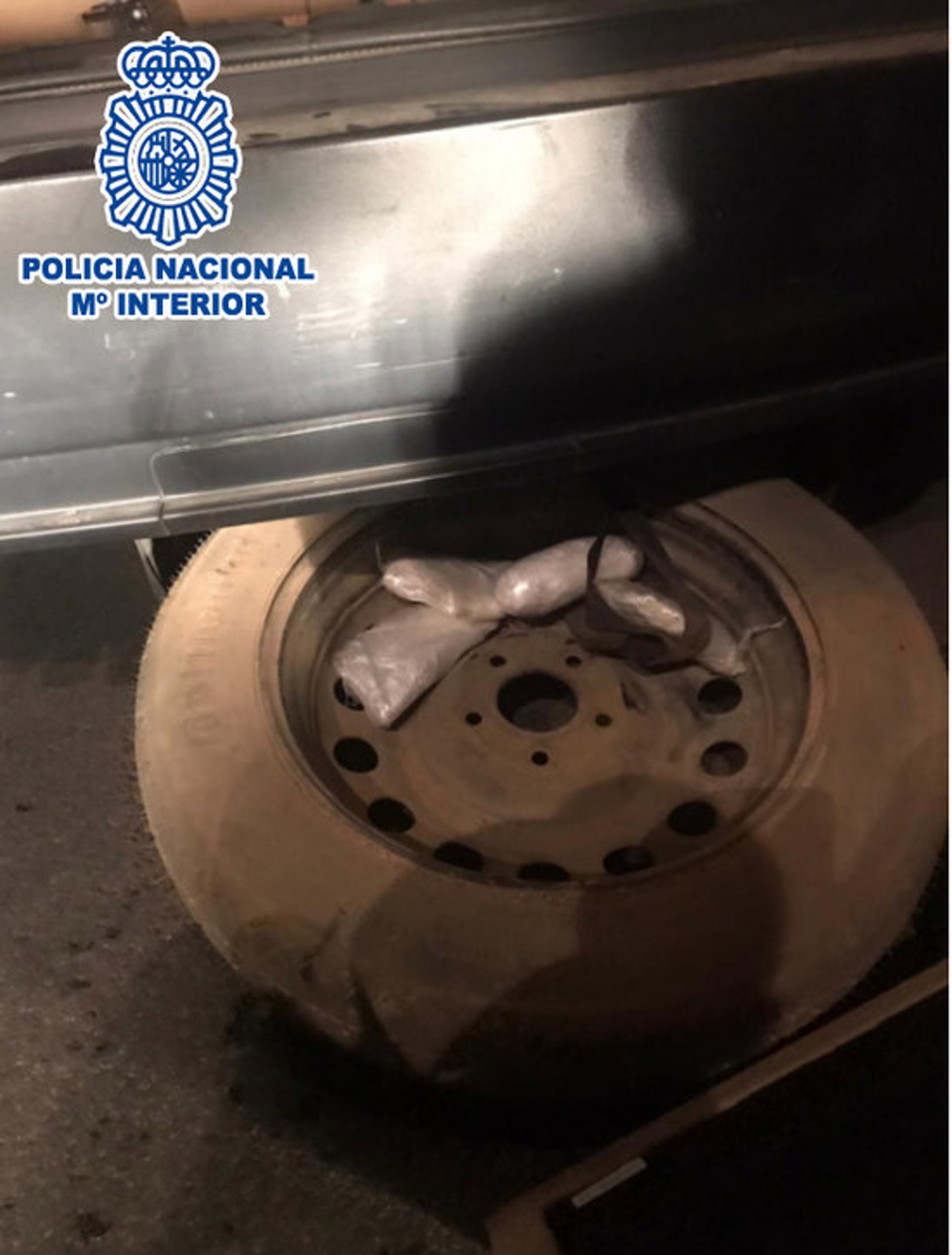 Paquets amb cocana localitzats a la roda de recanvi d'un vehicle. (vertical) - Cedida a l'ACN per la Policia Nacional (ACN)