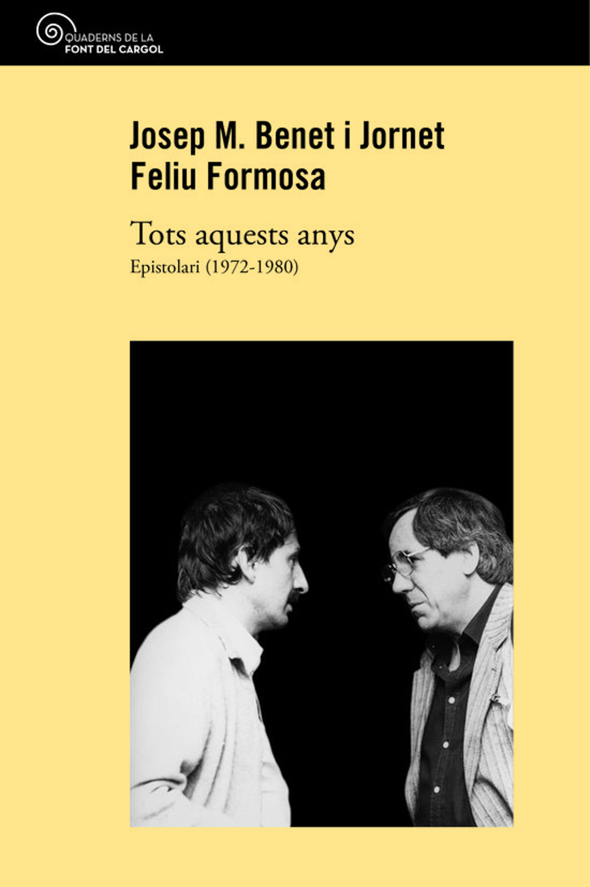 Portada del volum 'Tots aquests anys, epistolari 1972-1980', l'intercanvi epistolar entre Feliu Formosa i Josep Maria Benet i Jornet, editat per Quaderns de la Font del Cargol (vertical). - Quaderns de la Font del Cargol (ACN)