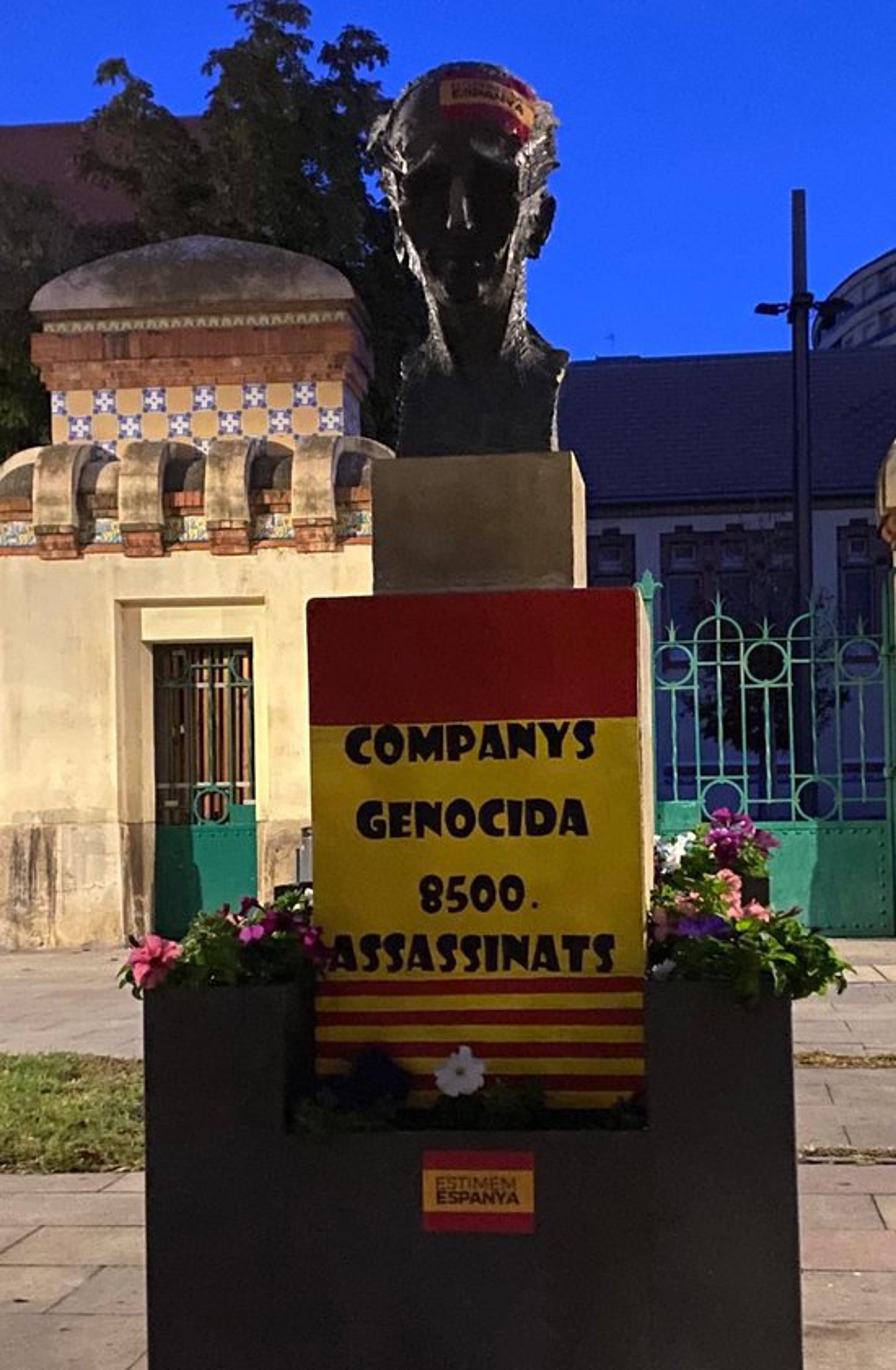 Lleida.-El monument dedicat a Lluís Companys situat davant del Teatre de l'Escoxador de Lleida ha aparegut aquest 12-O amb un cartell amb els colors de la bandera espanyola i de la senyera on s'hi podia llegir 'Companys Genocida 8.500 assassinats'. Els autors de l'acció també han enganxat un adhesiu amb la bandera espanyola i el lema 'Estimem Espanya', segons es pot veure en la imatge publicada per Vox Lleida a les xarxes socials. El cartell i l'adhesiu, per, ja han estat retirats. El monument ha patit en els darrers anys diferents actes vandlics com ara pintades i, fins i tot, en dues ocasions es van endur el bust de qui fou president de la Generalitat que presideix l'escultura per, posteriorment, va ser recuperat i recollocat al seu lloc.