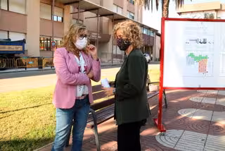 Pla americ de la gerent de la Regió Sanitria de les Terres de l'Ebre, Mar Lleix, i l'alcaldessa de Tortosa, Meritxell Roigé, davant l'Hospital de Jesús. Imatge del 30 de setembre del 2020 (horitzontal) - Anna Ferrs (ACN)
